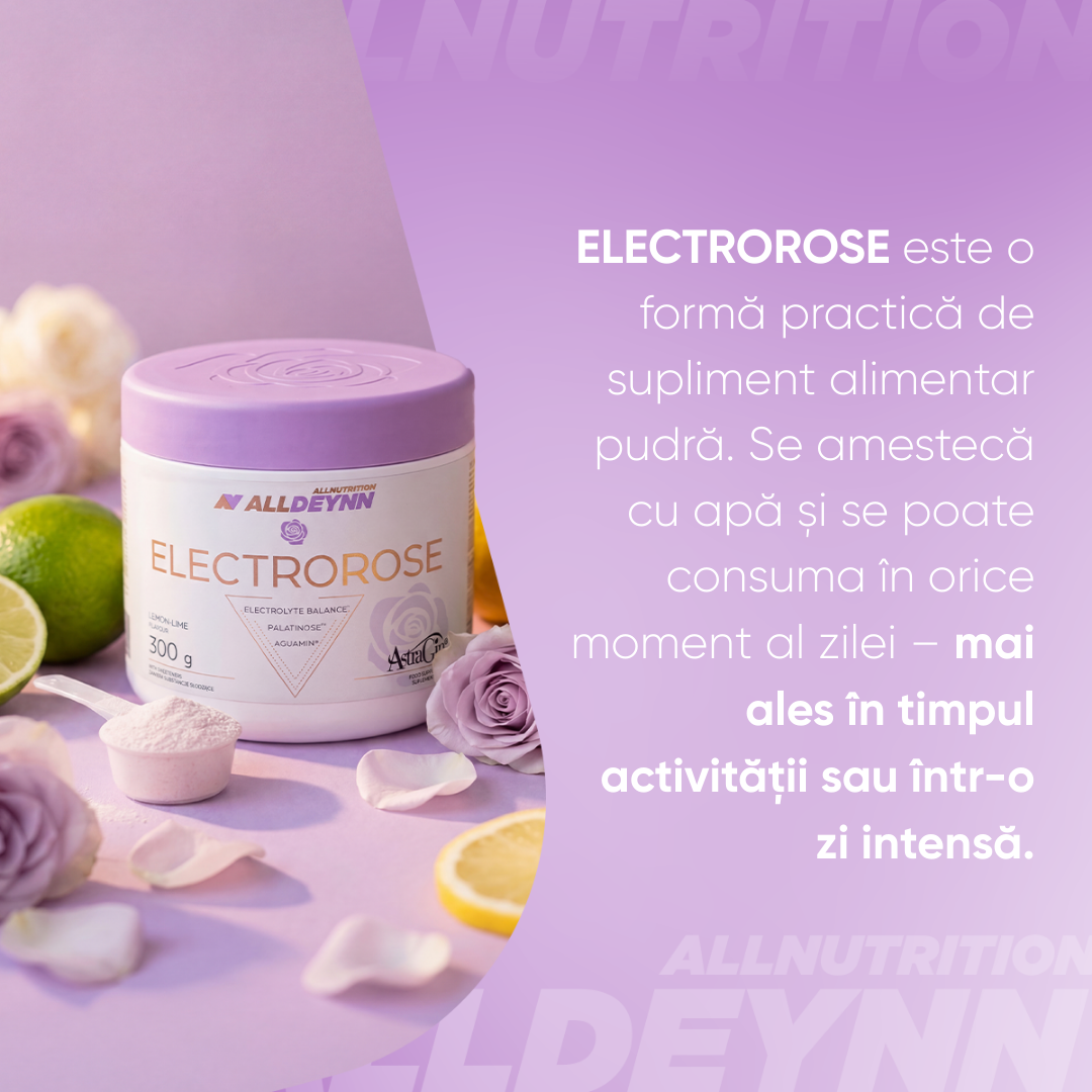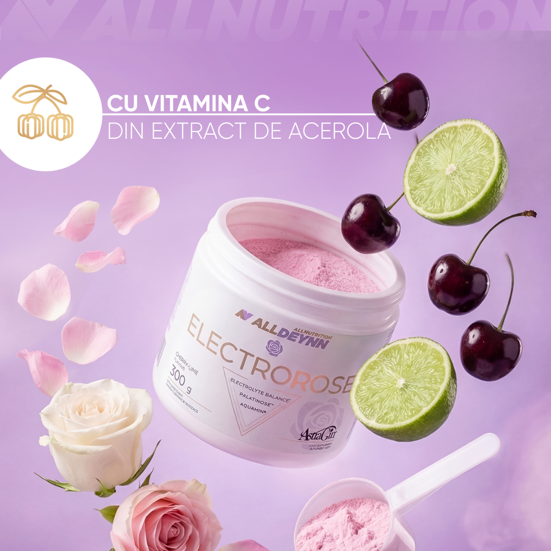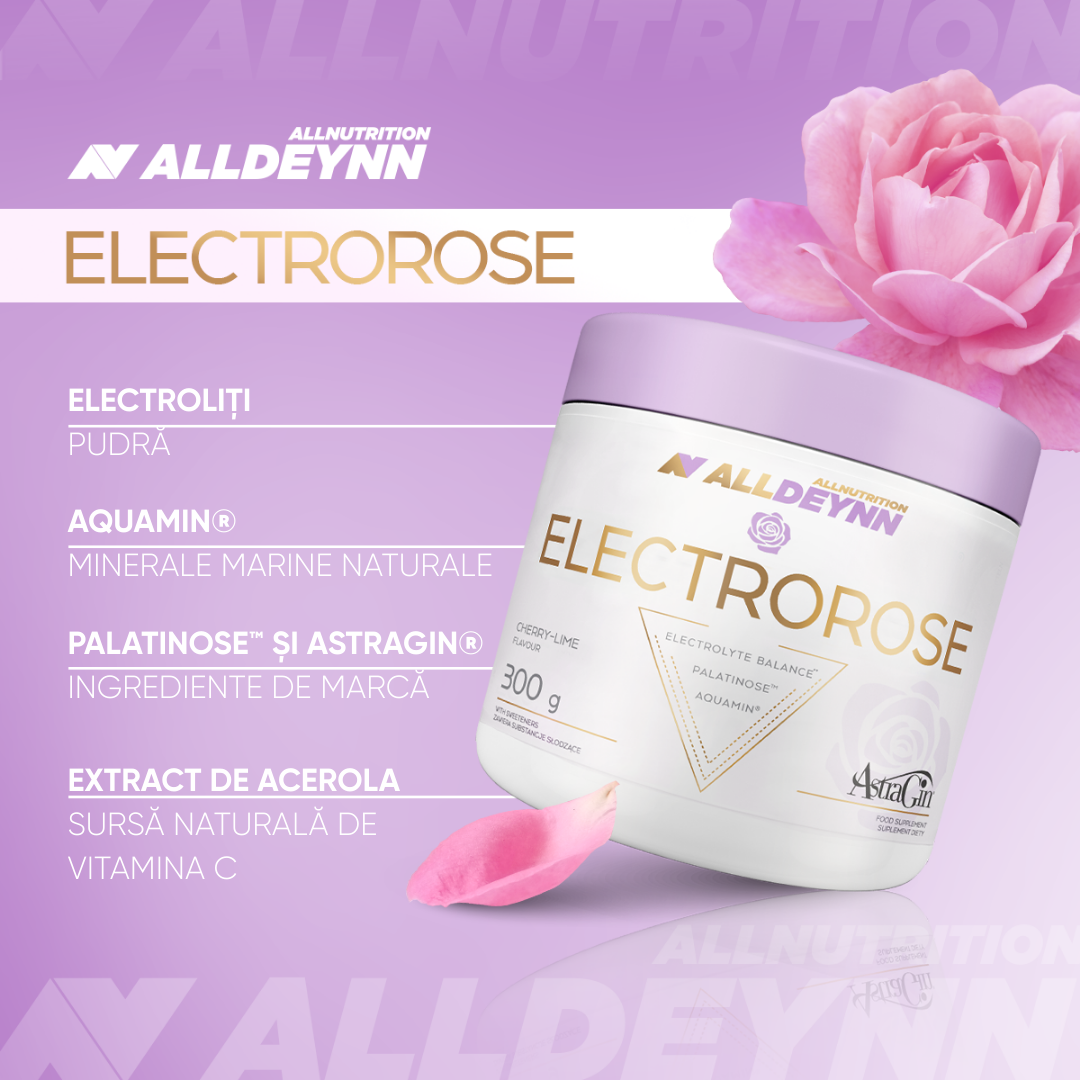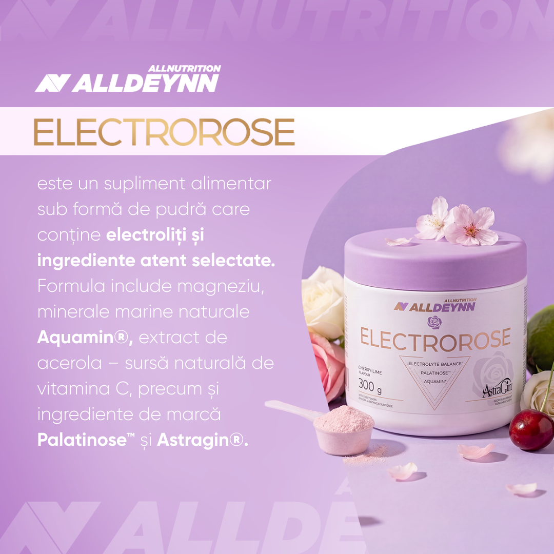 Îți dorești ca organismul tău să funcționeze la capacitate maximă în fiecare zi? ALLDEYNN ELECTROROSE este un supliment alimentar modern sub formă de pulbere, din care poți prepara o băutură delicioasă și răcoritoare. Creat pentru persoanele active, reprezintă o combinație unică de electroliți și formule brevetate PALATINOSE™, AQUAMIN® și ASTRAGIN®. Produsul susține organismul în provocările zilnice – oferind sprijin exact atunci când ai cea mai mare nevoie.