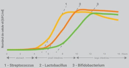 Tulpinile au fost selectate astfel încât să acționeze sinergic, susținându-se reciproc. Graficul de mai jos ilustrează curba de multiplicare a bacteriilor utilizate în intestinele noastre în funcție de timp. Când un tip de bacterii își încheie ciclul de creștere, altul este pregătit să acționeze. O porție (1 pastilă) acționează timp de mai multe ore.