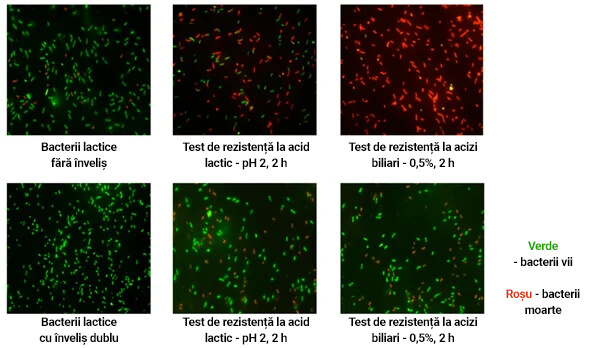 Supraviețuirea bacteriilor dublu încapsulate a fost atent studiată. Mai jos se află observații microscopice care ilustrează rezistența bacteriilor lactice încapsulate la condițiile care le așteaptă în timpul trecerii prin tractul digestiv.