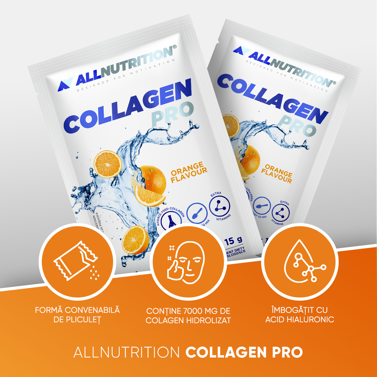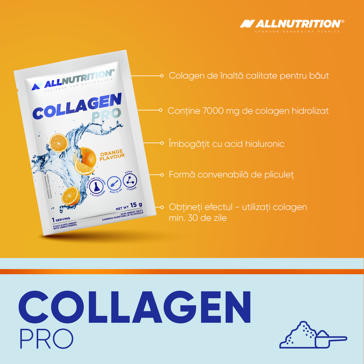 ALLNUTRITION COLLAGEN PRO este un supliment alimentar care furnizează până la 7000 mg de colagen hidrolizat sub formă de pliculețe practice - de dizolvat și de băut. Conține multe substanțe valoroase și necesare. Conține multe substanțe valoroase și necesare. Datorită conținutului său de vitamine și minerale, susține sănătatea și sistemul musculo-scheletic..