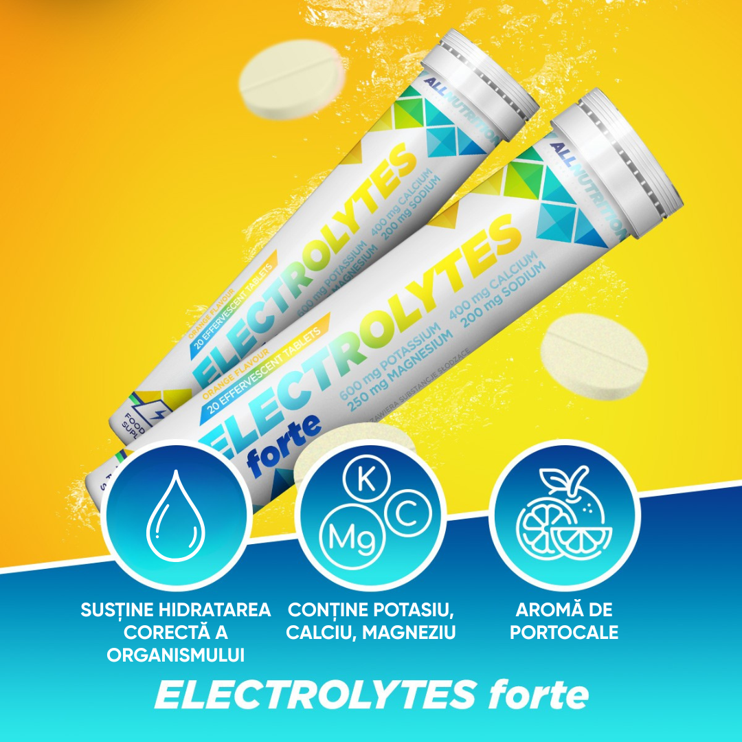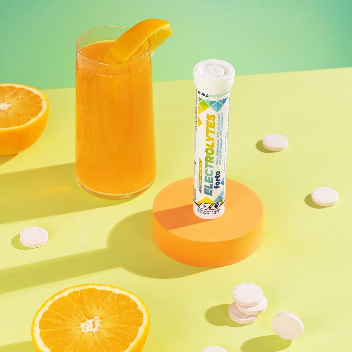 ALLNUTRITION ELECTROLYTES FORTE este un supliment alimentar sub formă de tablete efervescente, cu un gust delicios de portocală. Este o formulă avansată creată pentru a reface rapid electroliții și vitaminele esențiale pierdute în timpul efortului fizic intens, al transpirației sau în zilele călduroase. Ai grijă de hidratarea și echilibrul corect al organismului tău!