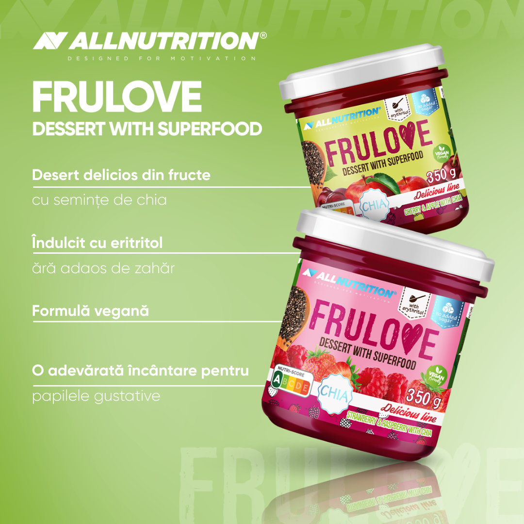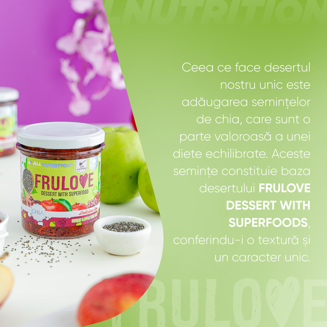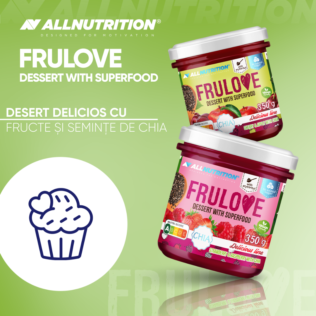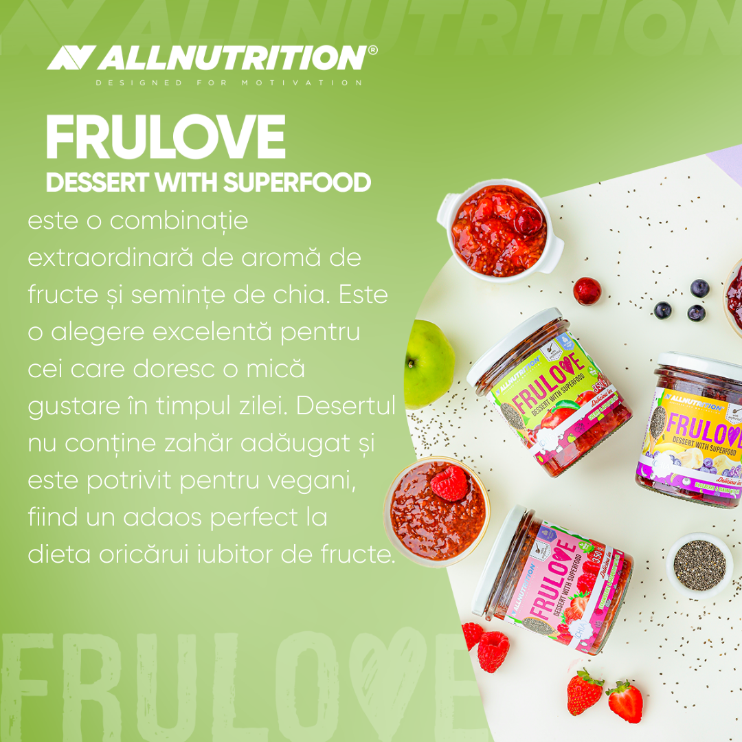 ALLNUTRITION FRULOVE DESSERT WITH SUPERFOODS este o combinație extraordinară între gustul fructelor și semințele de chia. Este alegerea perfectă pentru persoanele care își doresc un moment de răsfăț în timpul zilei. Desertul nu conține zahăr adăugat și este potrivit pentru vegani, reprezentând completarea ideală a dietei pentru orice iubitor de arome fructate.
