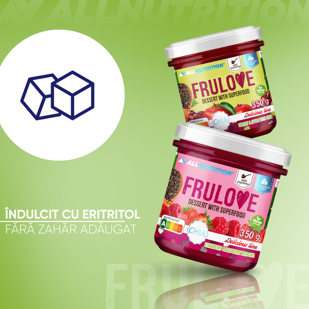 În FRULOVE DESSERT WITH SUPERFOODS avem grijă ca gustul dulce să nu însemne compromisuri. Desertul nostru este îndulcit cu eritritol – un înlocuitor cu valoare energetică zero, ceea ce permite păstrarea gustului delicios, reducând în același timp consumul de zaharuri. Produsul conține doar zaharuri prezente în mod natural. Este o alegere excelentă pentru cei care doresc să reducă în mod conștient zahărul din alimentație, fără a renunța la deserturile preferate.