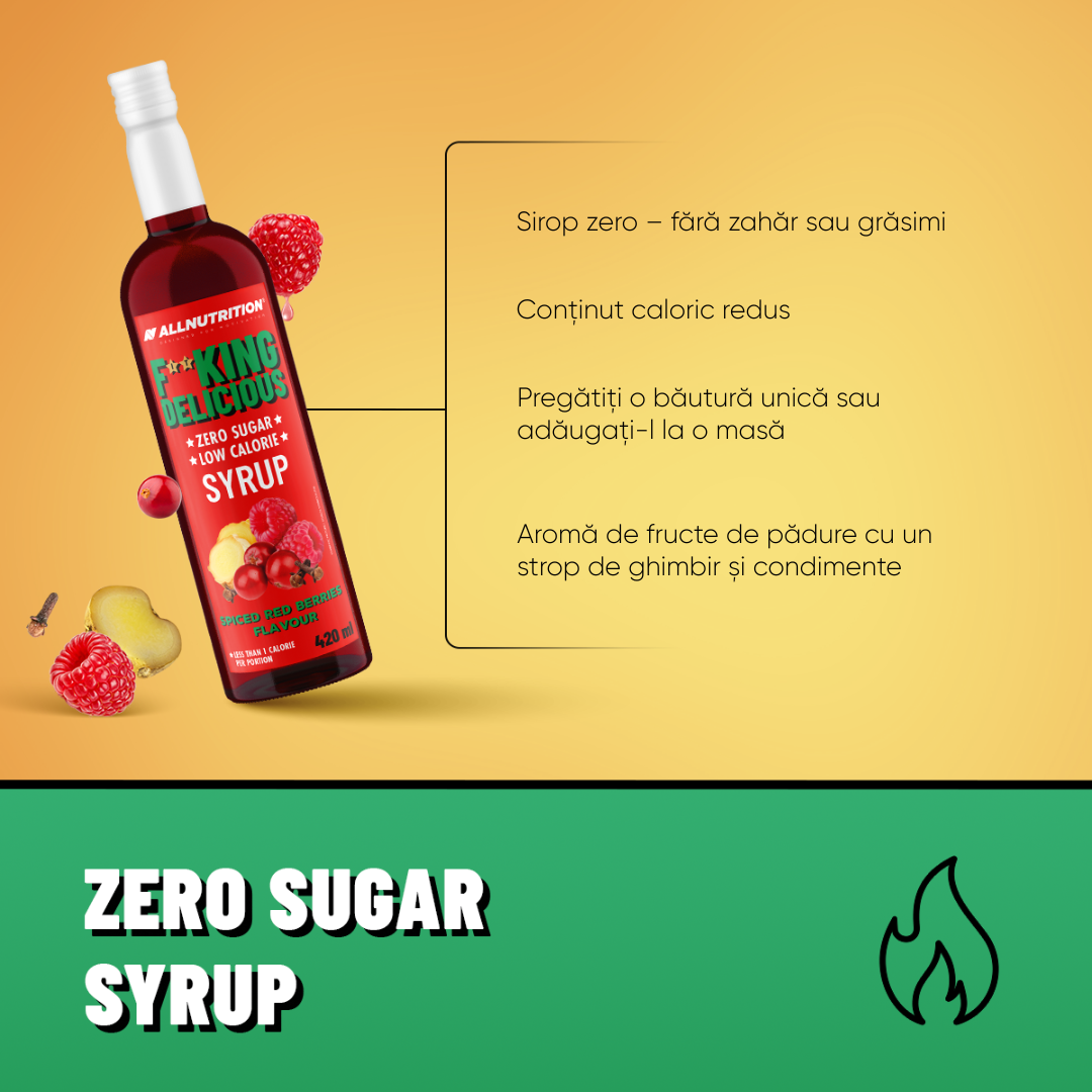 ALLNUTRITION FITKING DELICIOUS SYRUP ZERO este un sirop fără zahăr și grăsimi, hipocaloric, cu un gust deosebit. Îndeplinește cele mai exigente așteptări gustative, fără a încărca dieta. Ideal ca adaos dulce pentru apă sau preparate preferate: terci de ovăz sau înghețată.