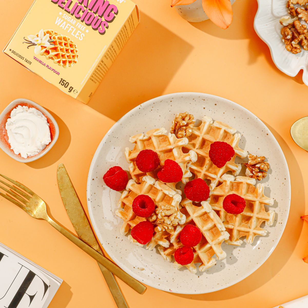 făină de grâu, îndulcitor: maltitoli, uleiuri și grăsimi vegetale (palmier și rapiță), ouă, făină de soia , fructooligozaharide, amidon de porumb modificat, stabilizator: glicerol, aroma de vanilie, sare, emulgator: lecitine [dinsoia], agenți de creștere: difosfați, carbonați de sodiu, fosfați de calciu, conservant: sorbat de potasiu, suc de lămâie, proteină de roșcove, fibră de roșcov