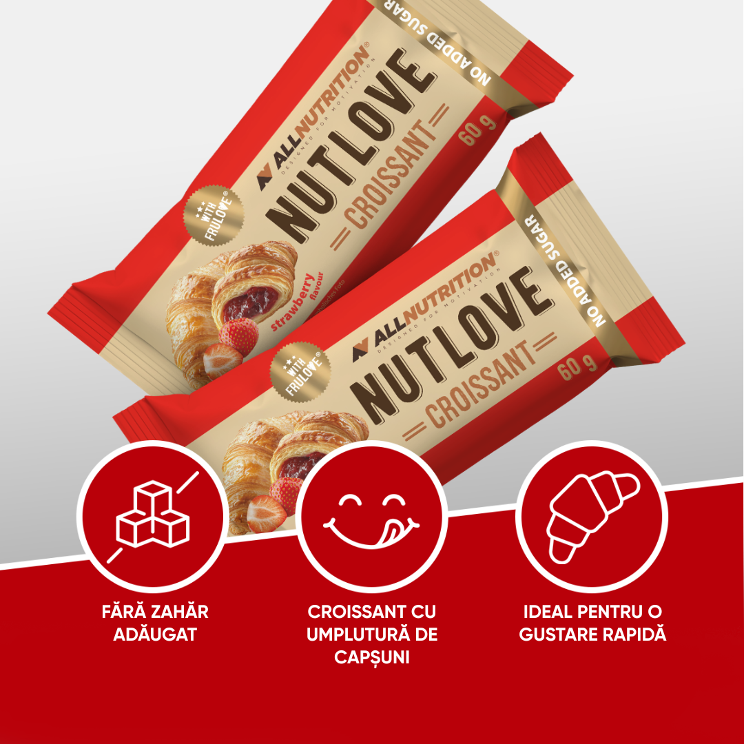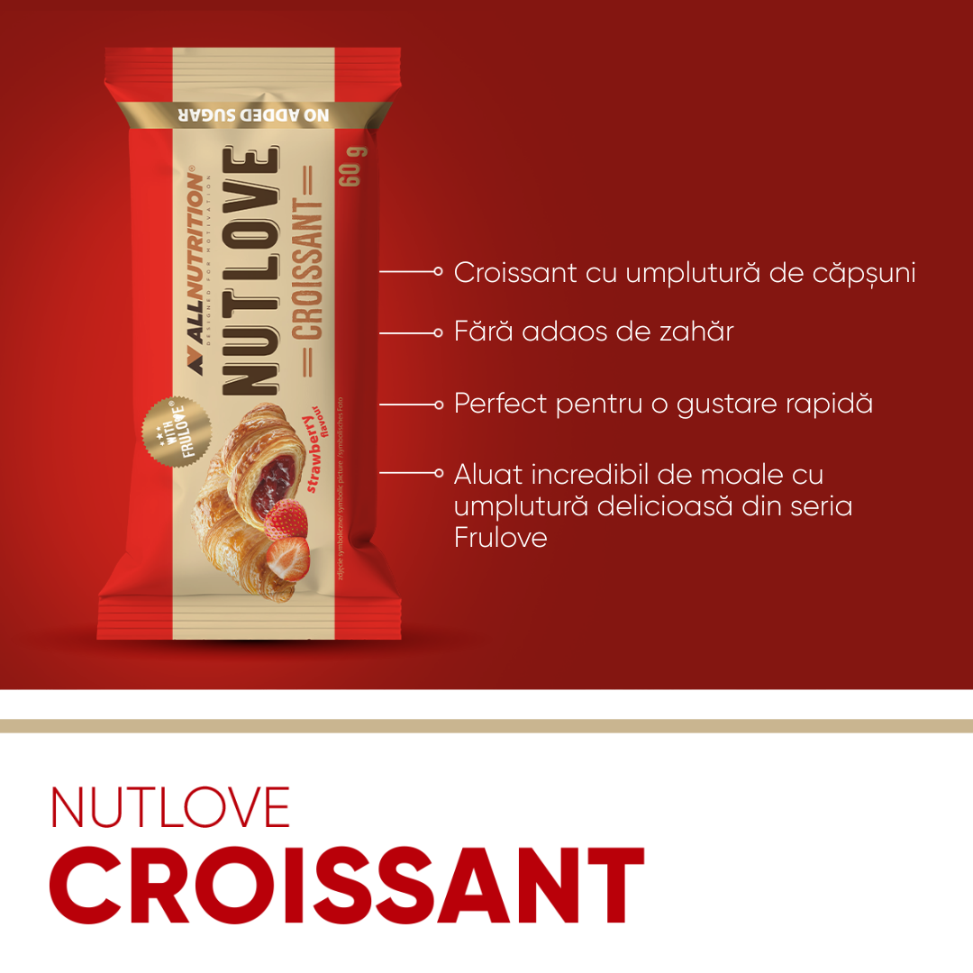ALLNUTRITION NUTLOVE CROISSANT STRAWBERRY este un croissant moale, extraordinar de bun, cu o umplutură fructată delicioasă! Creat pentru toți cei care vor să se bucure de un gust dulce, fără să își facă griji din cauza excesului de zahăr.